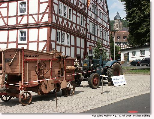 | Vor den Wohnhäusern des ehemaligen Guts Reinhardt stehen historische landwirtschaftliche Fahrzeuge des Bulldog Clubs Nordhessen e.V. |