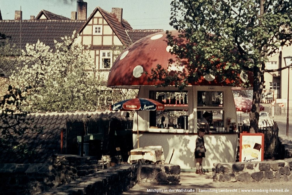 Zumindest der Heimweg vom Kindergarten im Schwenkenweg oder aus der Grundschule am Stellberg führte in den späten 60er Jahren entlang der Wallstraße. Und dort taucht fern in der Erinnerung der Milchpilz auf - Verkaufsstelle für Trinkmilch, Süßigkeiten und Eis. Sehr lange stand er allerdings nicht mehr dort, irgendwann war er verschwunden. Und trotzdem ist der Milchpilz mit der leuchtend roten Fliegenpilzhaube vielen in der Erinnerung geblieben.